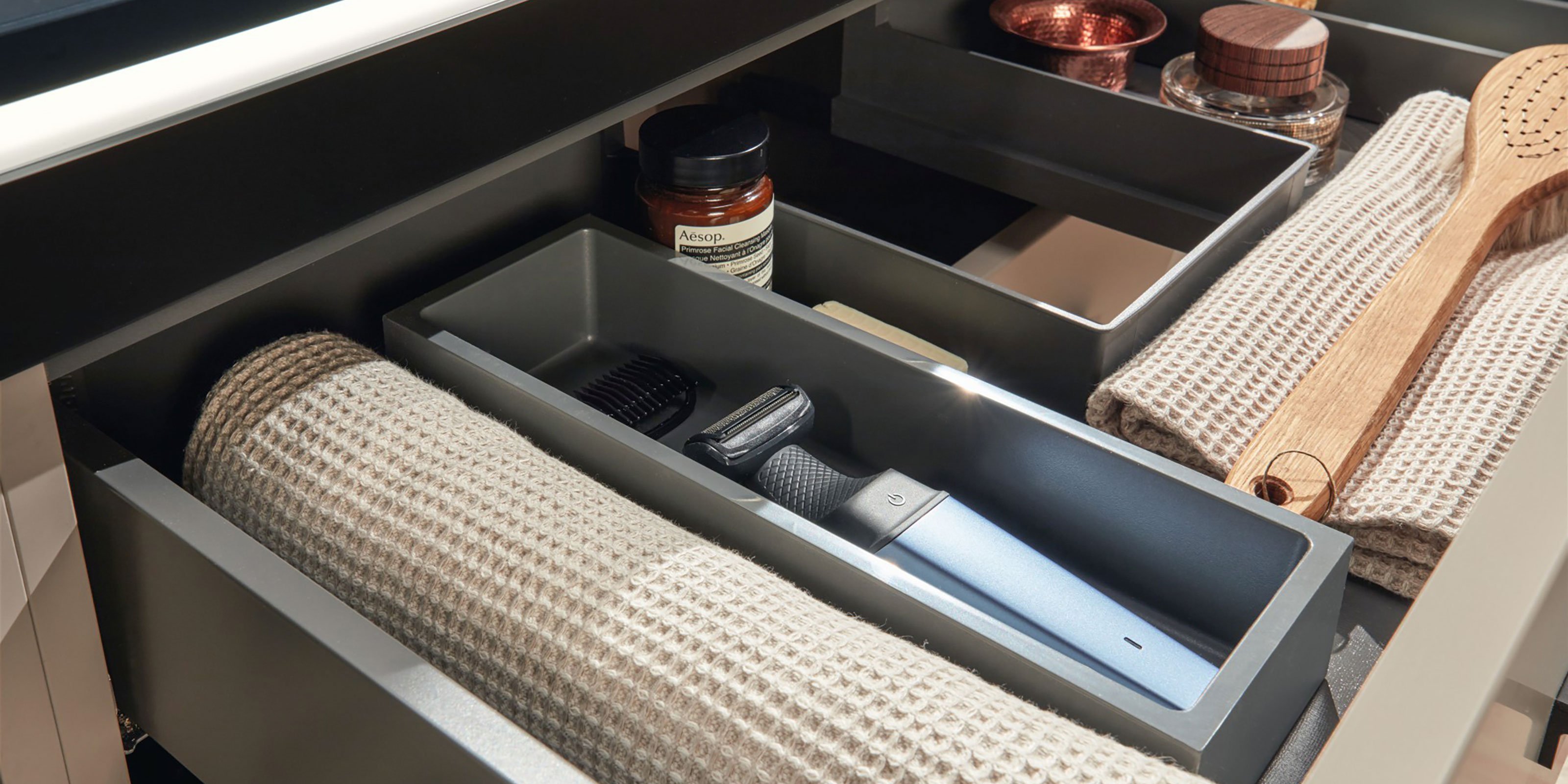 Der symmetrische Doppelwaschplatz mit vier Auszügen und offenem, breitenvariablen Regal bietet spielend Platz für zwei. Seine pflegeleichte, schwarz matte Oberfläche mit Anti-Fingerprint-Effekt steht in gekonntem Kontrast zum hellen Holzton der 2morrow Platte Slim. Einen edlen Touch verleihen die Griffe in Gold Matt mit dazu passenden Wandarmaturen. Die beiden auffälligen, runden Reflection Lichtspiegel LOLA sorgen für stimmungsvolles Licht, das per Raumschaltung bedient wird.